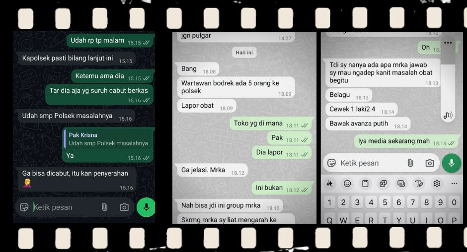 Tidak cukup sampai disitu, sebuah tangkapan layar percakapan juga mencatat nama Rahmat, yang diperkirakan merupakan salah satu oknum yang bertugas di Polsek Pamulang. Dalam percakapannya Rahmat menyebut ada “wartawan bodrek” yang melaporkan temuannya terhadap toko yang menjual obat keras.