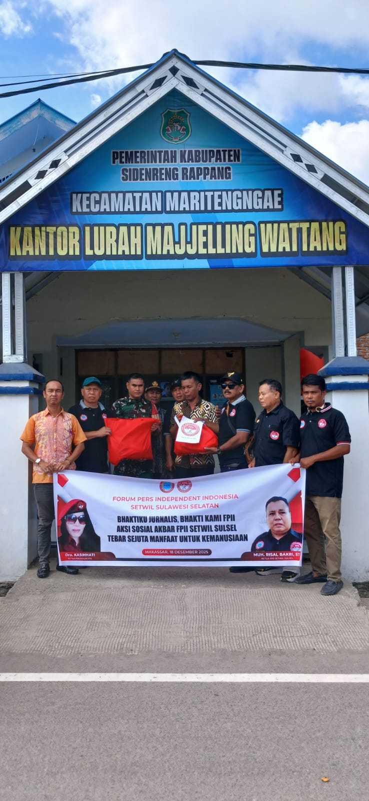 ​Rangkaian penyerahan bantuan dimulai di Kabupaten Sidrap. Bertempat di Kelurahan Majelling Wattang, Kecamatan Maritengngae Sidrap, penyerahan paket sembako diawali Kejari Sidrap melakui Kasi Intel Kejaksaan Sidrap, Muslimin Lagalung, SH. Langkah ini kemudian disusul oleh Ketua FPII Setwil Sulsel, Risal Bakri, di saksikan Lurah Majelling Wattang, Andhi, beserta jajarannya. Kehadiran tokoh-tokoh ini menjadi bukti sinergi yang kuat antara Insan Pers, aparat penegak hukum, dan Pemerintah setempat dalam misi kemanusiaan.
