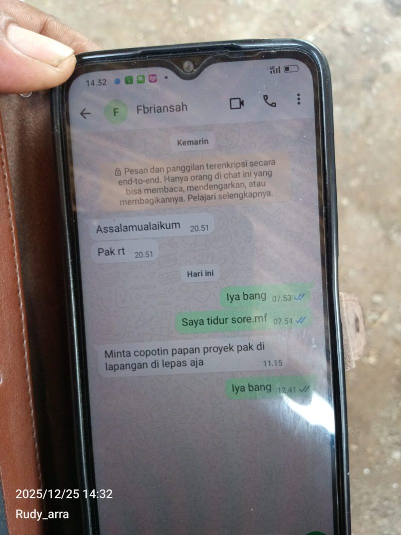 “Saya dihubungi lewat WhatsApp oleh pihak kontraktor bernama FB, isinya menyuruh papan proyek dicopot saja,” ungkap Ketua RT 05.
