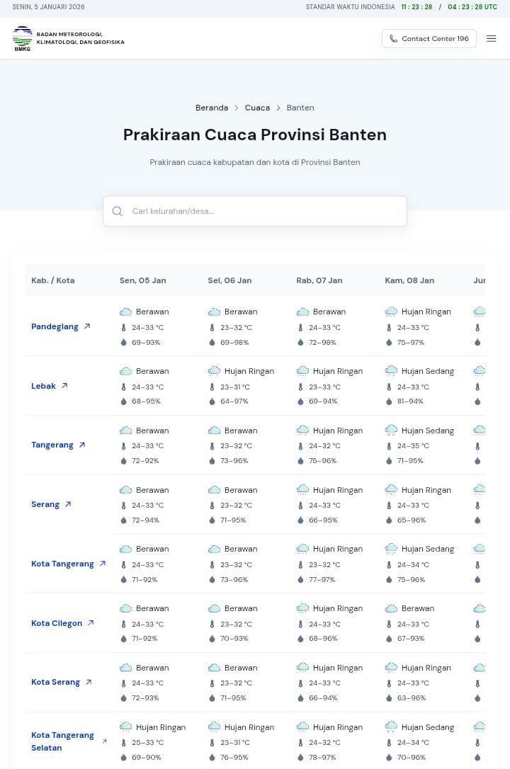 Untuk kondisi udara, BMKG Banten mencatat suhu udara berkisar antara 23 hingga 33 derajat Celsius, dengan kelembapan udara 60 hingga 90 persen. Sementara itu, angin bertiup Dari arah Barat Laut hingga Utara dengan kecepatan 05 – 35 km/jam.