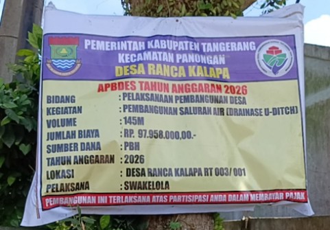 BERITABUANANEWS.ID,Tangerang | Proyek pemasangan U-ditch yang berlokasi di RT 003 RW 001, Desa Ranca Kalapa, Kecamatan Panongan, Kabupaten Tangerang, menuai sorotan. Kegiatan yang dikerjakan secara swakelola oleh Pemerintah Desa Ranca Kalapa dengan nilai anggaran Rp97.958.000 tersebut diduga tidak sesuai dengan standar spesifikasi teknis, Kamis, (16/04/2026).