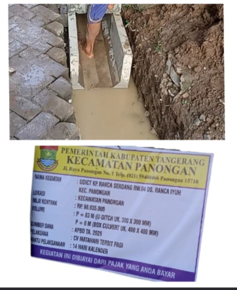 BERITABUANANEWS.ID,Tangerang | Proyek pembangunan saluran air (U-ditch) di Kampung Ranca Serdang, RW 04, Desa Ranca Iyuh, Kecamatan Panongan, Kabupaten Tangerang, menuai sorotan tajam. Proyek yang dikerjakan oleh CV Matahari Terbit Pagi dengan anggaran sebesar Rp98.935.000 dari Pemerintah Kecamatan Panongan ini diduga tidak memenuhi standar teknis pelaksanaan. Minggu (19/04/2026).