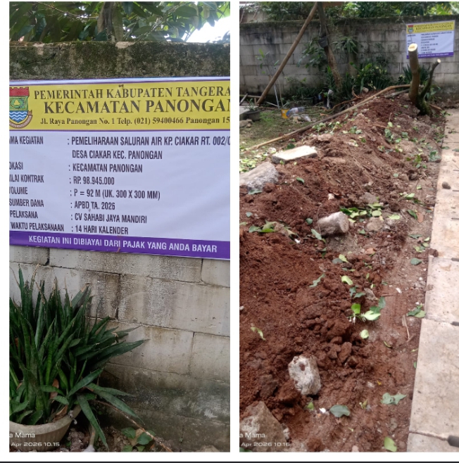 BERITABUANANEWS.ID, Tangerang | Proyek pembangunan drainase di Kampung Ciakar RT 002 RW 005, Desa Ciakar, Kecamatan Panongan, Kabupaten Tangerang, kembali menjadi sorotan. Pekerjaan yang dilaksanakan oleh CV Sahabi Jaya Mandiri tersebut diduga tidak memenuhi standar teknis konstruksi, meskipun menelan anggaran sebesar Rp98.945.000 yang bersumber dari APBD Kabupaten Tangerang melalui Kecamatan Panongan.
